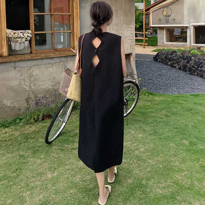 バックにダイヤ型のカットを施したノースリーブワンピース。