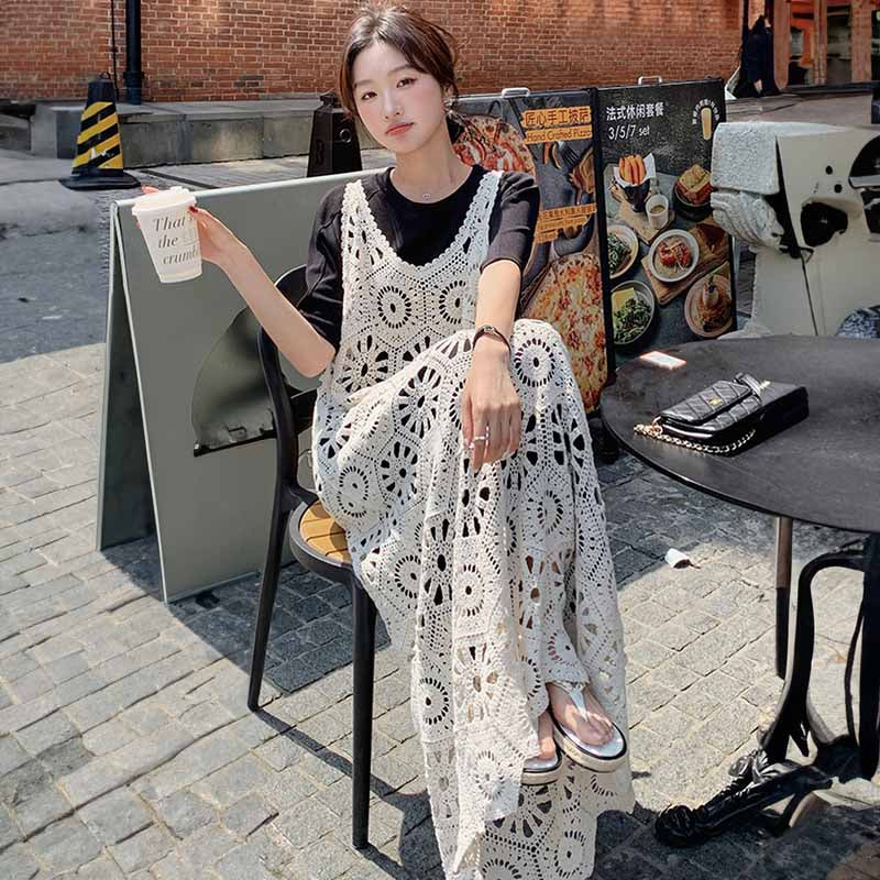 トレンドの鍵針レース編みを取り入れたレイヤードワンピース。