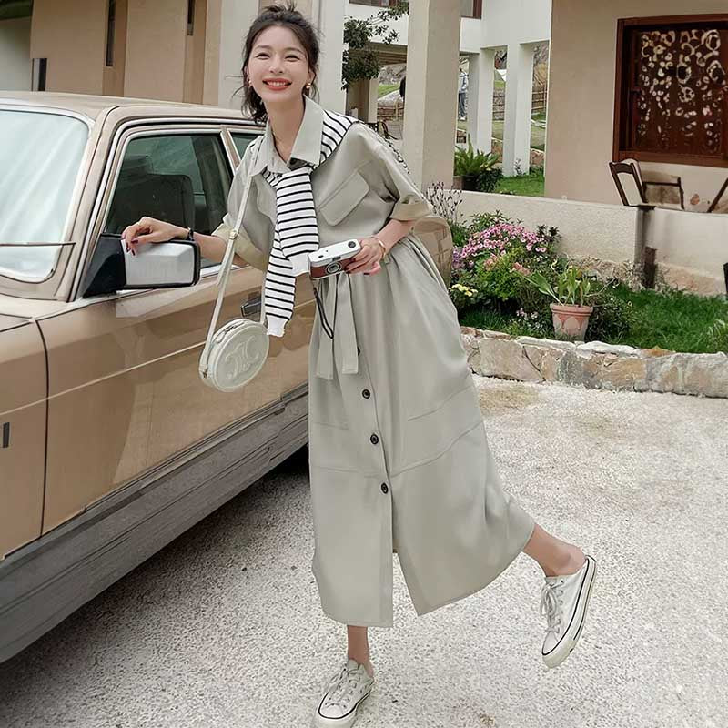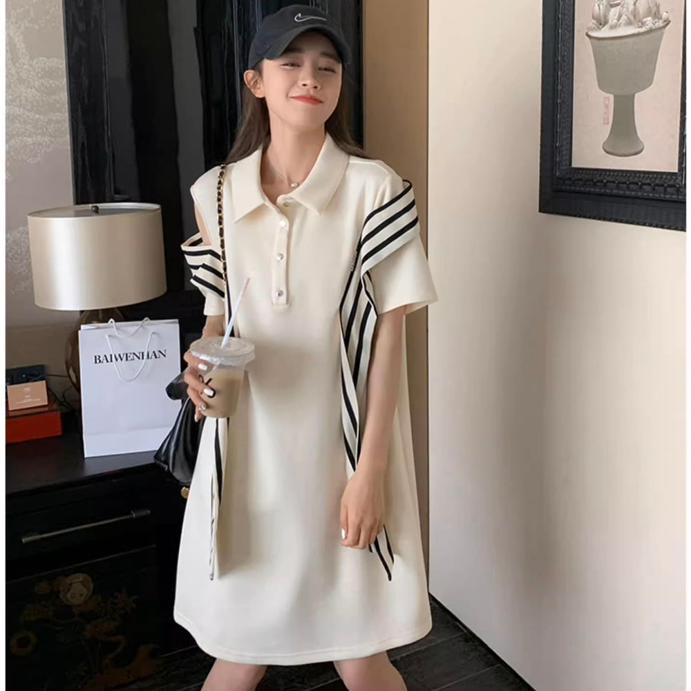 ストライプのリボン付きひざ丈ポロシャツワンピース。
